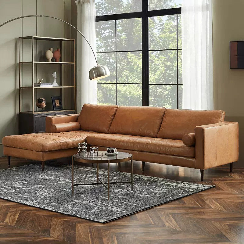 Description For a fresh spot in your space, turn to the mokdern sofa chaise. This invigorating piece breathes warmth into your home with its striking caramel faux leather upholstery, modern bolster pillows, and tapered legs. Wind down at the end of a long day and sink into this canyon of comfort. Size :L102.3″/W70.8″/H31.8″ Weight: 50kg/110 lb Materials: Wood/Leather/Sponge