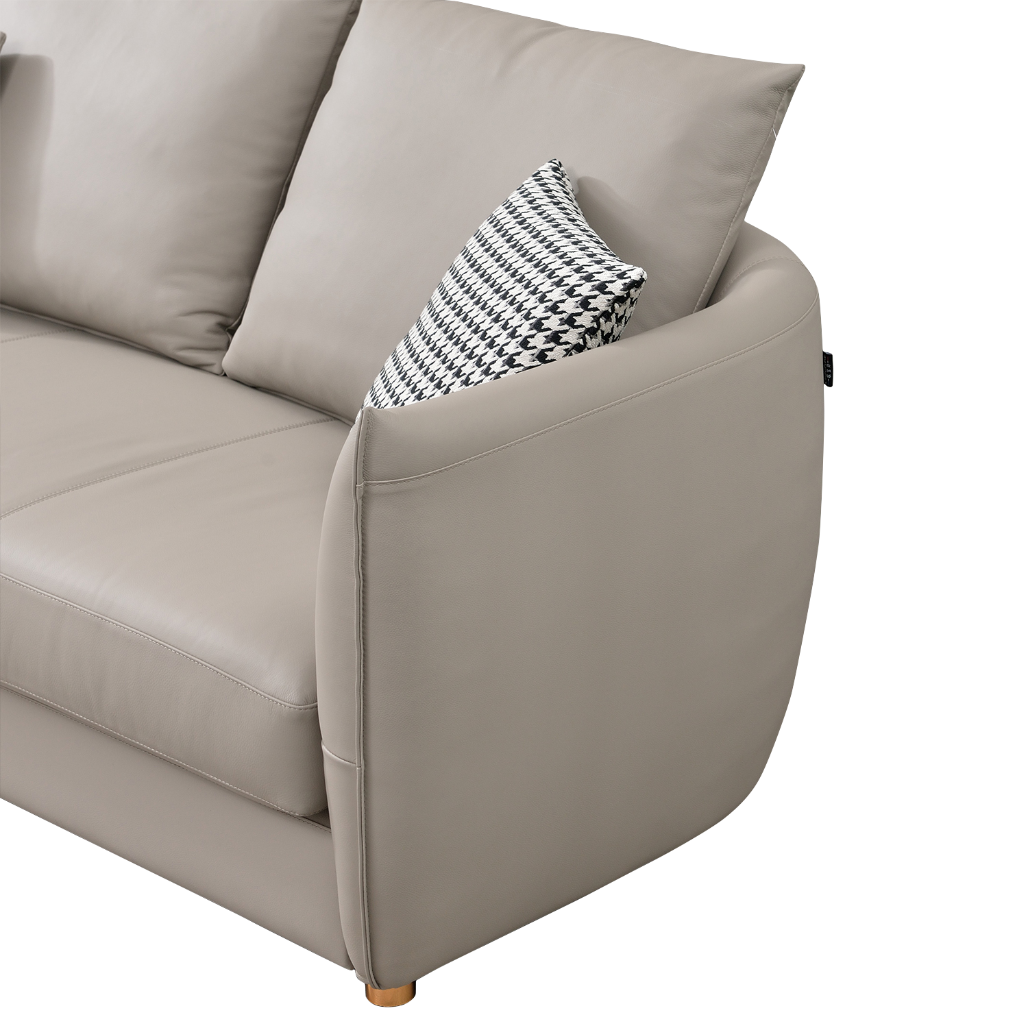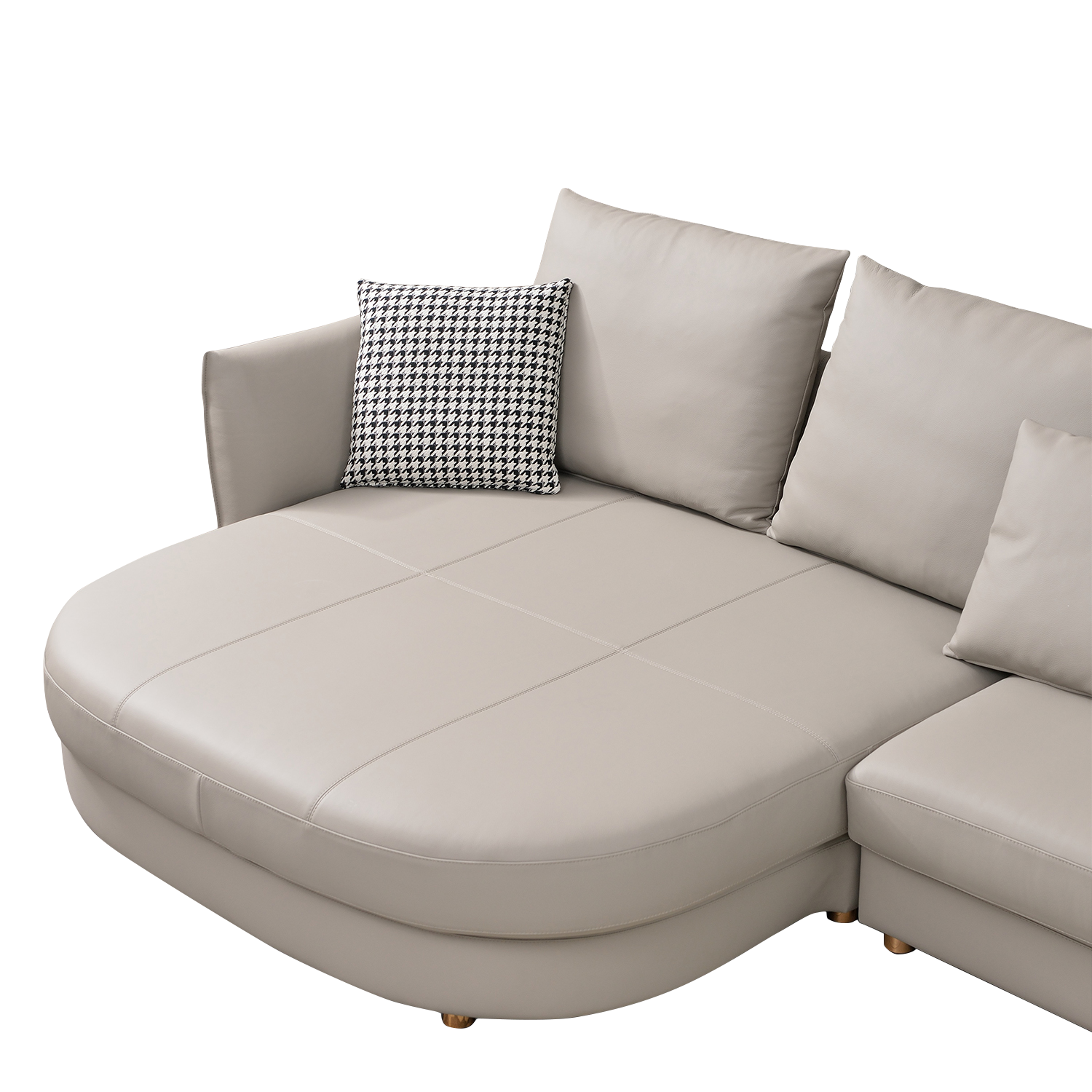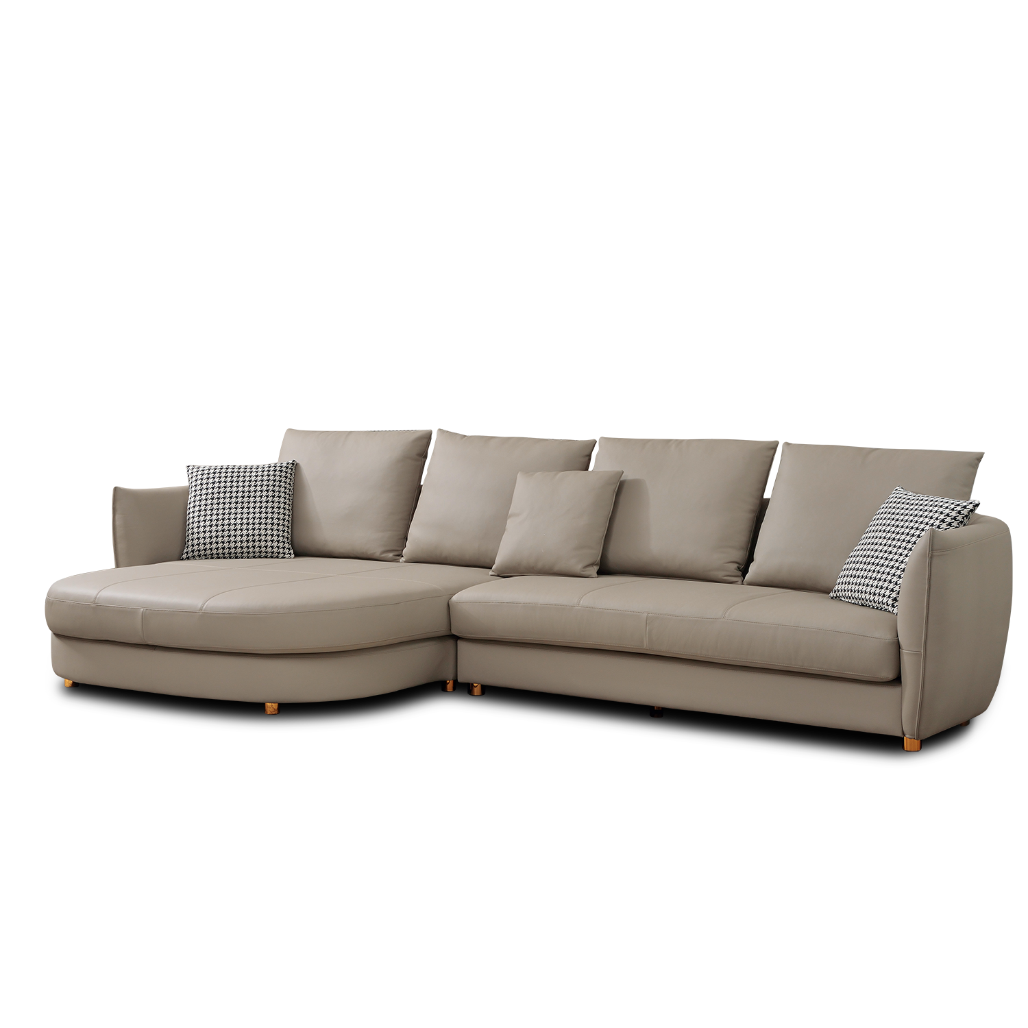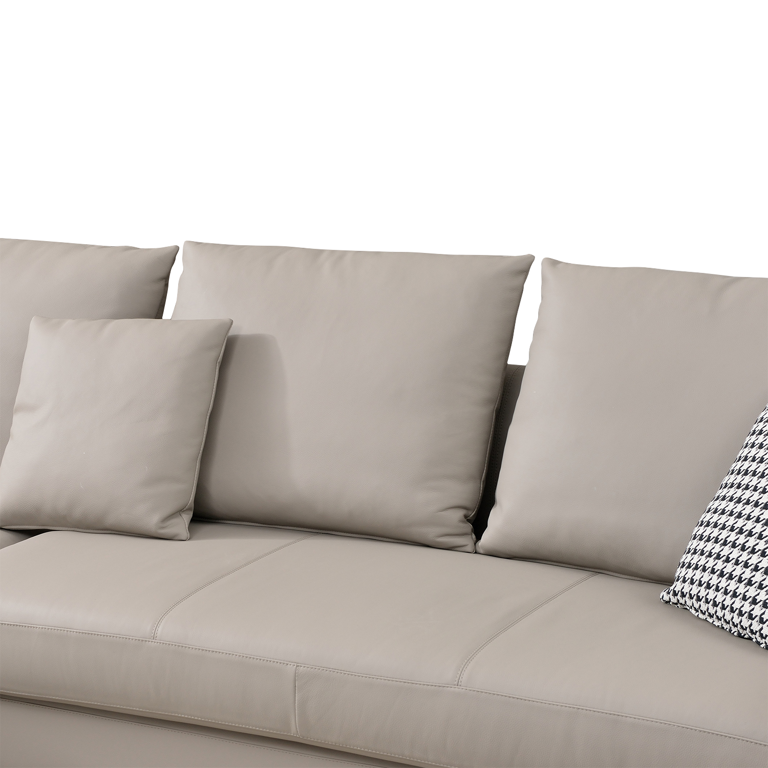 Description: This 4-seat L-shaped leather sofa is large and warm, with exquisite design and soft and generous volume. The backrest supports large pillows that are much higher than the armrests, creating a harmonious and impactful ensemble. Suitable for very large environments, whether it is living, contract, company or other, this sofa attracts attention in a discreet way, the base frame is combined with larch + solid slats, four sides are sealed, strong and firm, the seat bag is made of high Density sponge filling, good resilience, moderate softness and hardness for sitting, backrest doll cotton + down filling, comfortable and soft, this sofa will become the protagonist of any environment. Size : Left (L70″/W36″/H39″) Right (L64″/W65″/H39″) Total Length: 3.43 meters Weight: 60kg/132 pound Materials: Wood/Leather/Sponge
