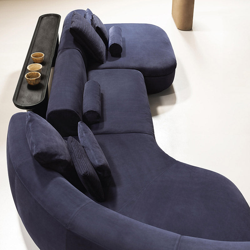 Its unique shape can be the accent object of living room as well as any interior. The curved design with velvet makes this sofa more silkiness. Crafted by solid wood frame and silver metal feet, which is stable and durable. The comfortable seat cushion is created by high quality foam and pocket springs which provide you enough support and soft sink. What's more, 6 cuddle cushions are very thick to support your lumbar region easily. Just simply assemble and upgrade your interior with this unique sofa.