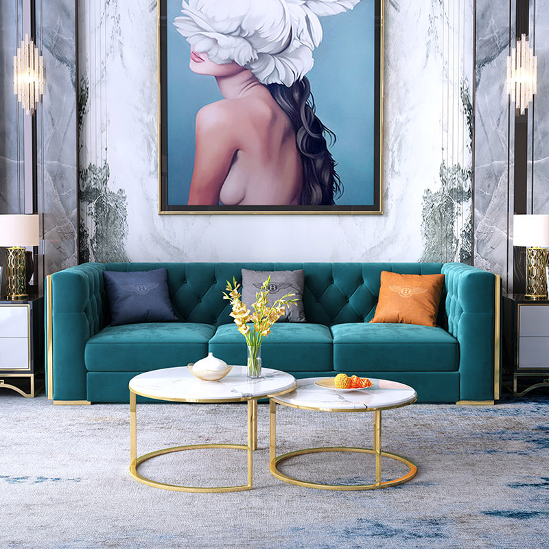 Description Style your living room with this charming sofa in its ultra-sleek and modern style that will bring out the best of your living space. This sofa offers soft down and Synthetic Fiber back cushion,High density foam seat cushion to bring your decor both classic style and ultimate comfort. Featuring a low-profile design, this sofa stands as a geometric design piece that can change the whole flow of your interior decor, creating an open and clean space for you and your family to enjoy.