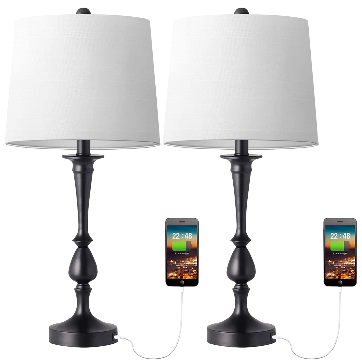 This pair of table lamps feature distinctive profiles that elevate the look of your living space while casting ambient light. The clean-lined dome bases are made from plastic and have nightlights as well as two integrated USB ports (each) for charging all your devices. The bulbs (included) and rotary on/off switches are found behind the round linen drum shades. Finials peak out at the top. These lamps stand nearly 25” tall, so make a statement on your entryway console, living room sofa table, or the dresser in your bedroom. Assembly is required.